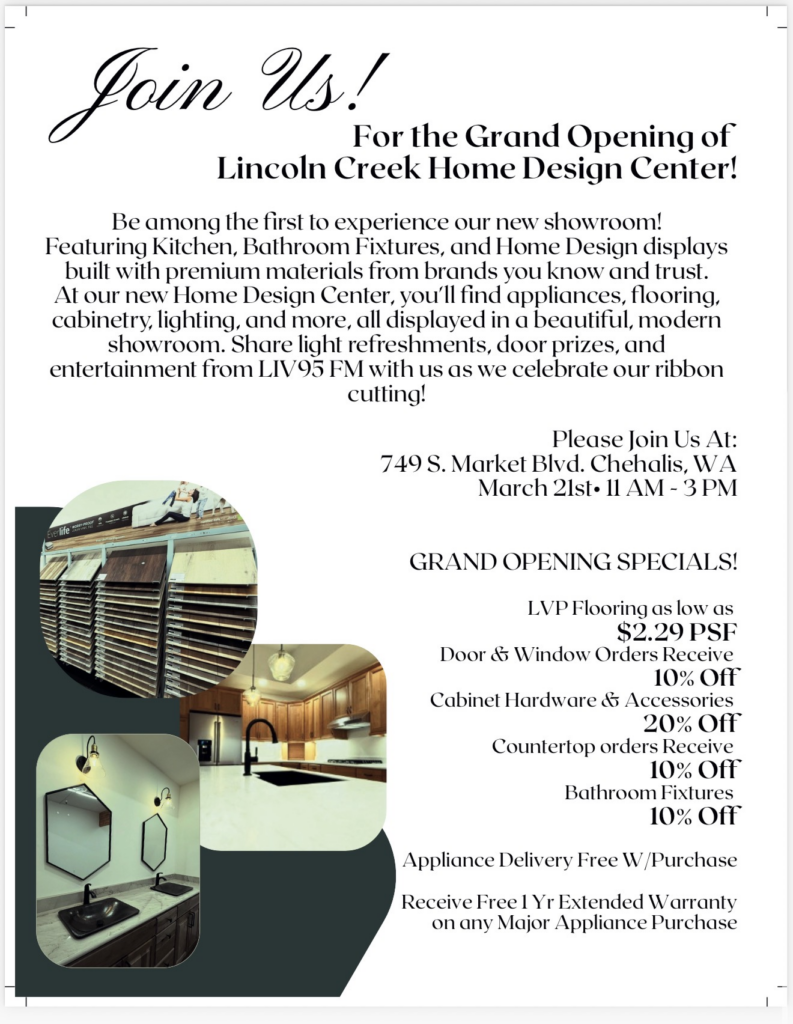 You’re invited to celebrate the grand opening of the new Lincoln Creek Home Design Center at Market Street Ace Hardware in Chehalis! After recently hosting a private preview for local builders, contractors, and industry specialists, they’re excited to officially open their doors to the community.