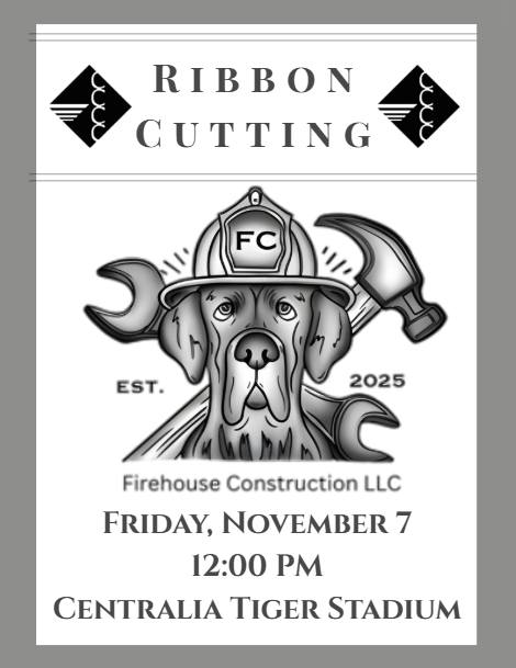 Mark your calendars!! Firehouse construction LLC is celebrating their brand new business with a ribbon cutting on November 7th!! They will be cutting the ribbon at Centralia Tigers Stadium at 12:00 PM! See you then!