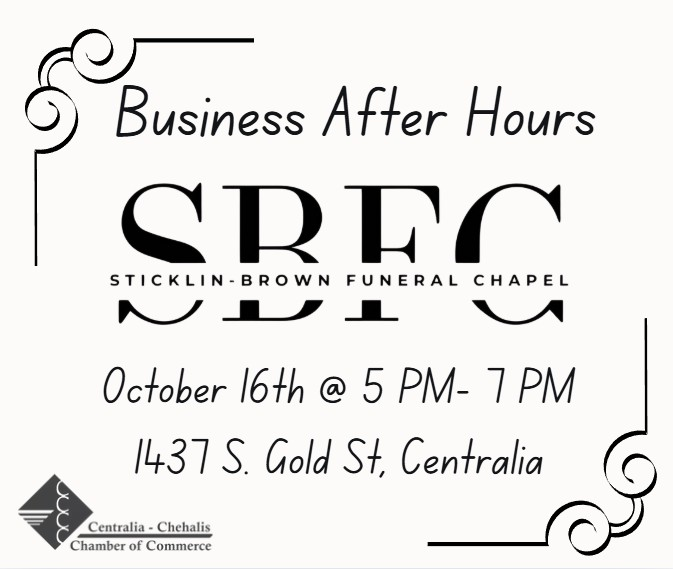 Mark your calendars! The Chamber will be celebrating its October Business After Hours at Sticklin Funeral Chapel! It will be held on October 16th, from 5-7 PM. You can find Sticklin Funeral Chapel at 1437 S Gold St, in Centralia! See you there!