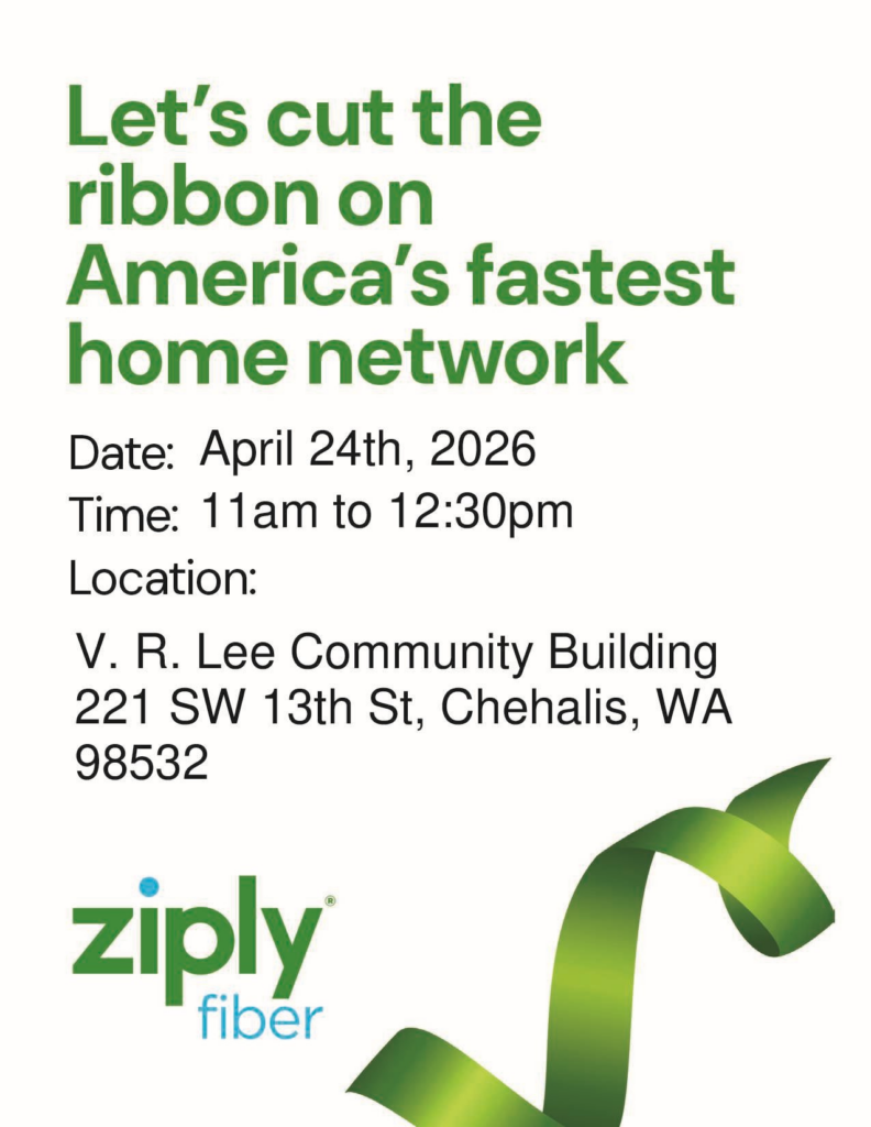 Mark your calendars!! ZiplyFiber is having their celebratory ribbon cutting on April 24th at 11 AM! It will be held at the V. R. Lee Community Building at 221 SW 13th St, in Chehalis. See you there!